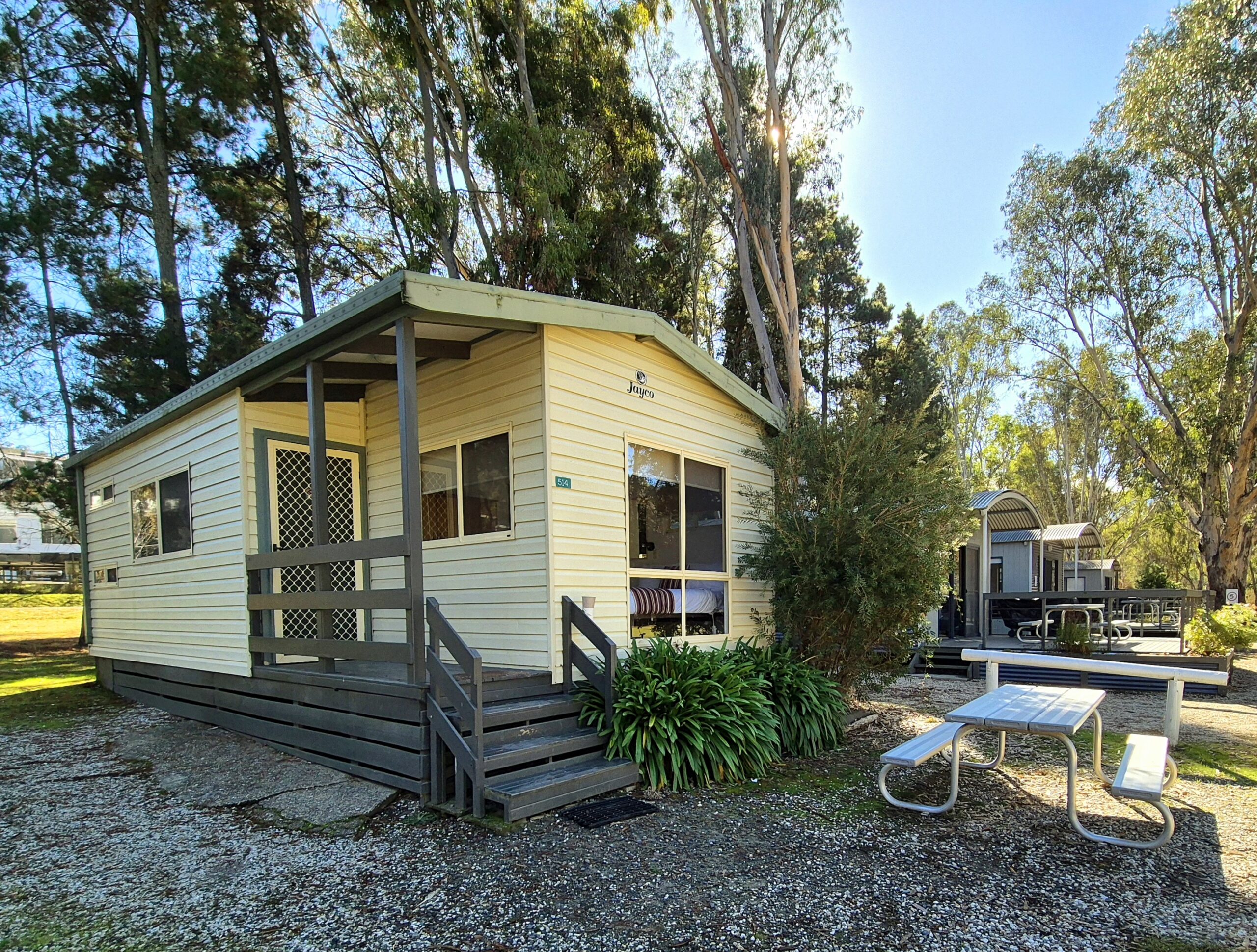 Open Plan, 2 bedrooms, bathroom with large corner spa, separate toilet and shower, queen bed, double bed with single bunk above, large patio. Sleeps 5.